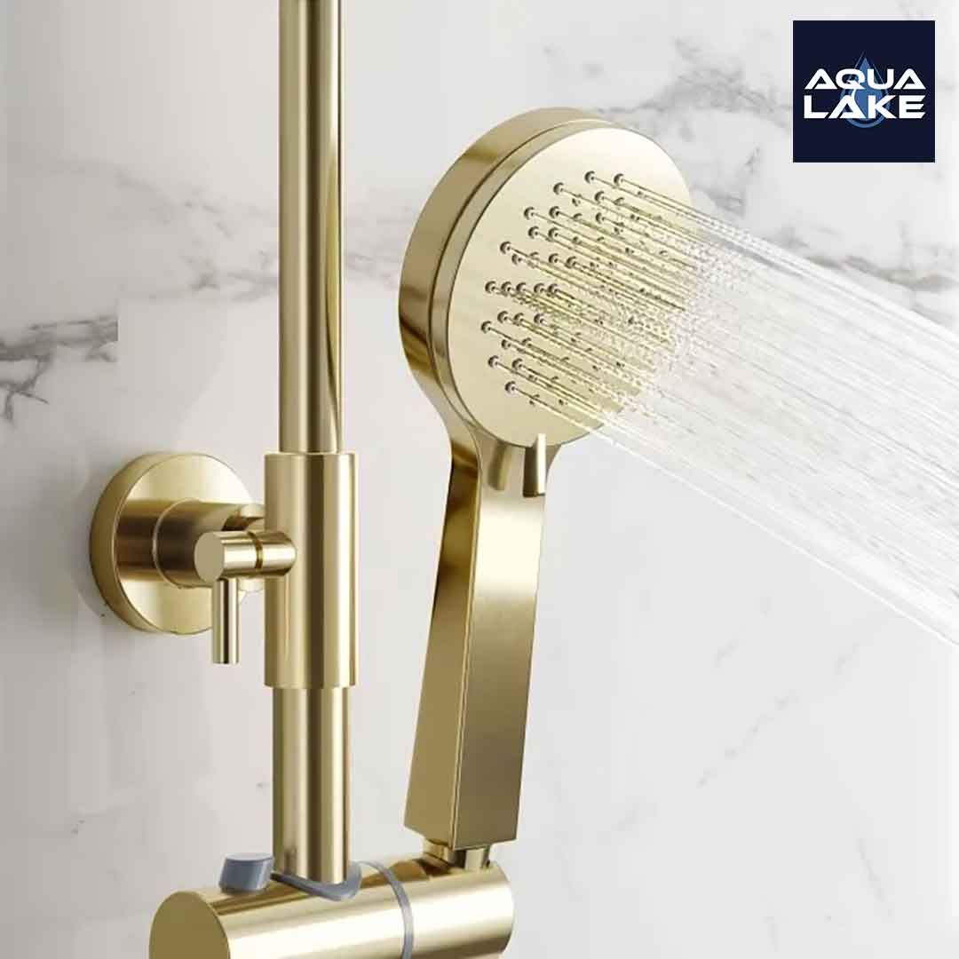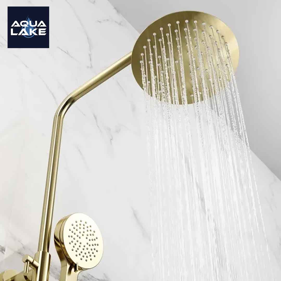 - Dual function shower system includes 200mm brushed brass round shower and hand shower