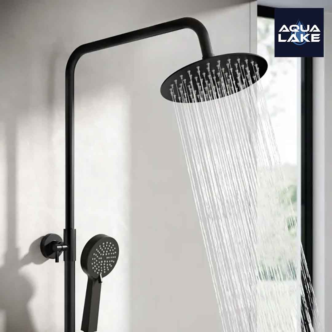 - Dual function shower system includes 200mm matt black round shower and hand shower